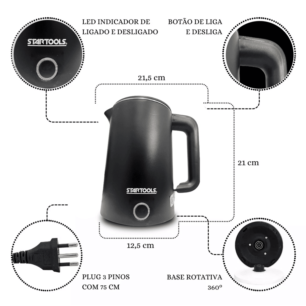 A Chaleira Elétrica 1,6L da Startools alia potência e praticidade em um design moderno, disponível nas cores Preta ou Branca. Com um sistema de aquecimento rápido de 1500W, você terá água fervida em poucos minutos, tornando seu dia a dia muito mais ágil, seja para preparar chás, cafés ou outras bebidas quentes.